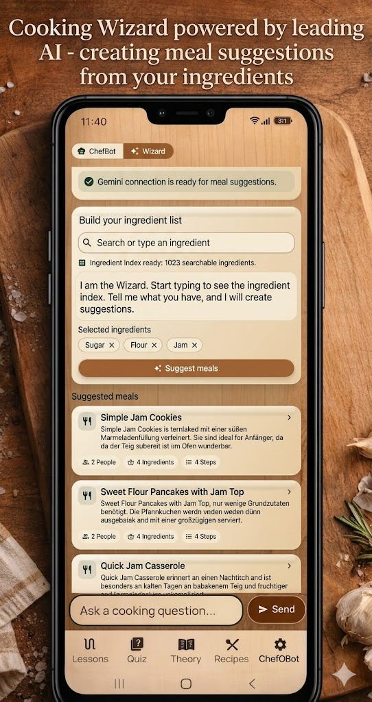 Enter what is already in your fridge, pantry, and kitchen. The Cooking Wizard turns those ingredients into useful recipe suggestions you can actually cook, complete with portions, quantities, and clear step-by-step guidance.